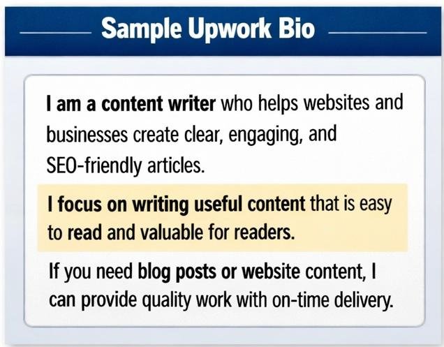 A beginner Upwork bio should be short, clear, and around 80–150 words.