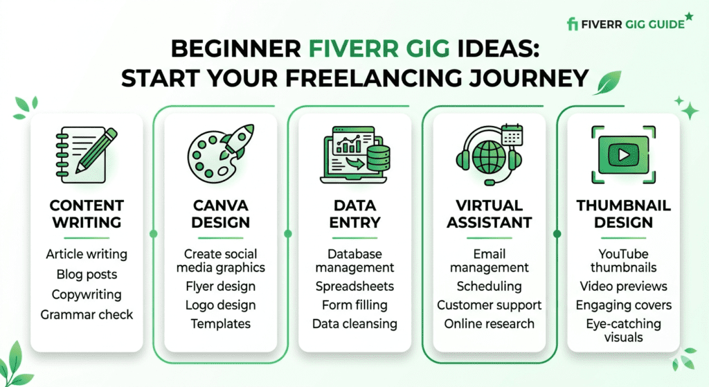 Content writing, Canva design, data entry, virtual assistant work, and thumbnail design are common beginner-friendly Fiverr gig ideas.